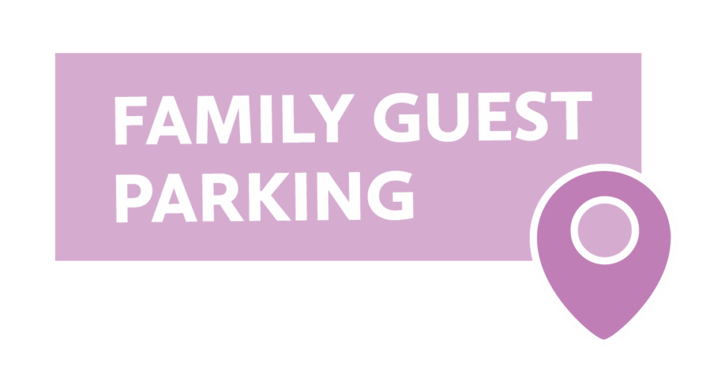 If you have children ages 3 1/2 to 12 years old, turn right and continue to Family Guest Parking and make your way toward the Guest Information at Building B.